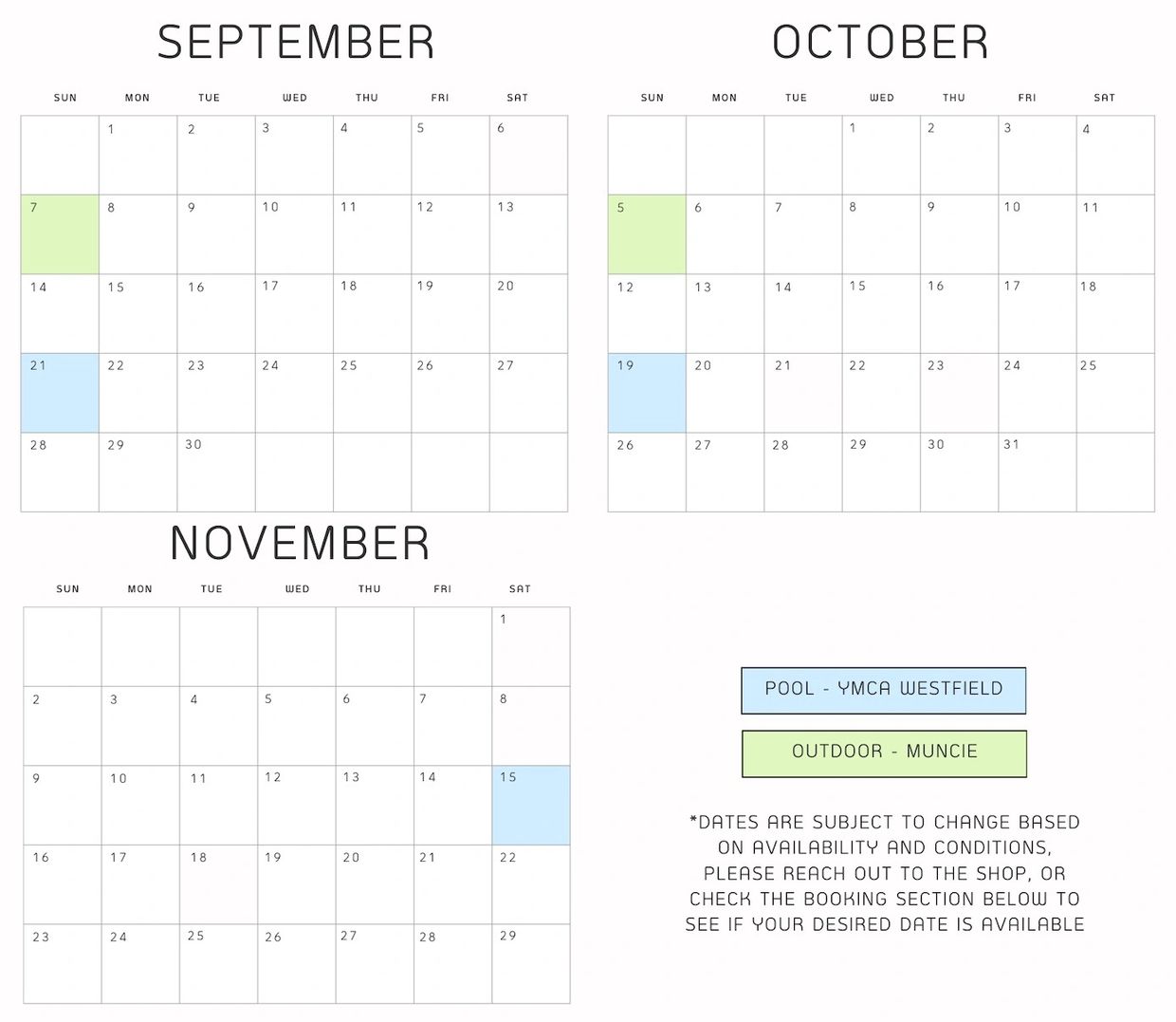We utilize the Westfield Aquatics YMCA pool for our confined water training. The pool is 50meters by 25meters and 10 lanes, with two moveable bulkheads, indoors, 80ºF (27ºC).
